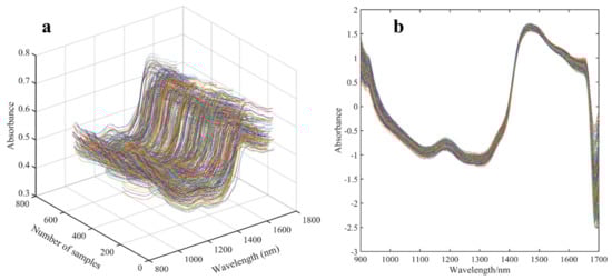 Raw and SNV pre−treatment spectra of samples. (a) Raw spectra; (b) SNV pre−processing spectra.