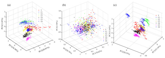 Figure 4 shows the results of the three-dimensional principal component analysis (PCA) distribution of the Dianhong tea samples. The distribution of principal component (PC) scores for single taste characteristics (ET taste values and spectra) and fusion data for the seven classes (T, C1, C2, C3, C4, C5, and C6) of samples showed a high degree of overlap in three-dimensional space between the different quality classes, and it was not simple to distinguish the different classes of samples effectively based on both single and fusion feature data, and there was an urgent need to introduce suitable chemometric methods to achieve effective identification of the quality classes of the samples for testing.