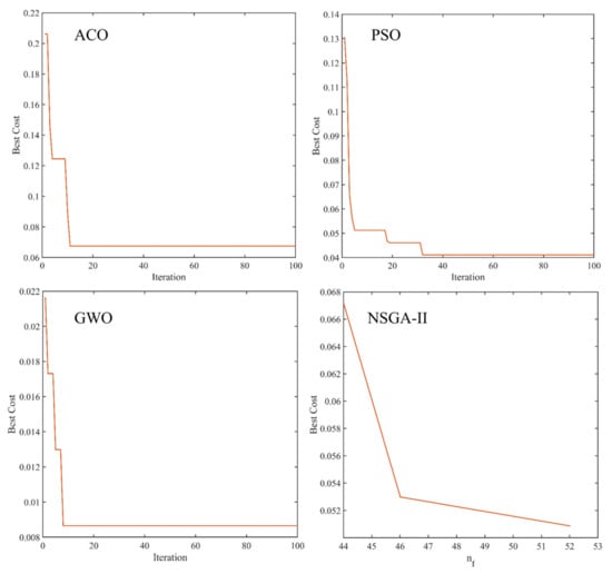 Four feature selection methods, namely ACO, PSO, GWO, and NSGA−II, were used to feature the low−level fused data from both sensors (ET and NIR spectra). From the convergence curve of feature selection in Figure 5, it can be seen that the above feature variable selection algorithm eventually converged after several iterations to obtain the smallest objective function value as the optimal solution.