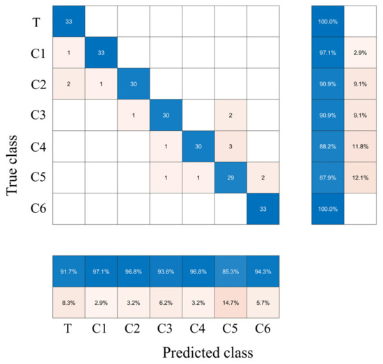 The feature fusion data obtained using different variable selection algorithms are the characteristic variables and the prediction results of the models built by combining different machine learning algorithms, as shown in Table 3. The results in Table 3 showed that the accuracy of the prediction set for all models was above 80%. The order of merit of the model performance for the same variable selection method was SVM > KNN > ELM. The CCRs of the ACO−ELM, ACO−KNN, and ACO−SVM models were the highest when analyzed in terms of the model effects of the same modeling approach. It can be seen that the ACO algorithm effectively extracted the feature variables related to the quality grade of Dianhong black tea samples. With fewer variables, the model achieved higher accuracy. The optimal classification model that was built was ACO−SVM with a CCR of 93.56% and only 12 variables were extracted. The ACO−SVM model was more robust than models built from fused data at a low level. To explain in detail the discriminative correctness of the prediction set samples in the ACO−SVM model, the confusion matrix results of the prediction sample distribution are presented in Figure 6. The results of the sample distribution in Figure 6 showed that the CCRs for the seven grades (T, C1, C2, C3, C4, C5, and C6) in the prediction class were 100%, 97.1%, 90.9%, 90.9%, 88.2%, 87.9%, and 100%, respectively. The CCRs for the corresponding seven levels in the true class were 91.7%, 97.1%, 96.8%, 93.8%, 96.8%, 85.3%, and 94.3%, respectively. The plotted confusion matrix gave a visual indication of the classification of the samples. The ACO-SVM discrimination model based on fused features was more effective in evaluating the quality of seven categories of tea samples.