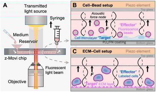 z-Movi working principle. (A) z-Movi utilizes a piezo-embedded microfluidic chip to perform the cell avidity measurement. The targets and effectors in the cell medium will be injected into the reservoir and then flushed into the flow chamber by pulling the syringe attached to the outlet of the chip. The light path of the imaging platform will acquire both transmitted and fluorescent light through the objective simultaneously. The target cells or extracellular matrix (ECM) proteins were flushed in first and incubated in the flow chamber to form a monolayer. To form a monolayer of cells (B), the chip was pre-coated with fibronectin (FN) or poly-L-lysine (PLL), which promotes cell attachment. Otherwise, the flow chamber bottom surface was coated with ECM proteins via physical absorption (C). (B) Cell–Bead setup. After coating the flow chamber bottom glass with a monolayer of target cells, fluorescence beads coated with fibronectin were flushed in as effectors and incubated with the monolayer to form interactions. Then, the piezo element driven by the software generated a standing acoustic wave in the flow chambers and applied the lifting force to the effectors to the acoustic force node (dashed line). (C) ECM–Cell setup. Replacing fluorescent beads in the Cell–Bead layout, labelled effector cells were flushed into the flow chamber and formed interaction with the ECM protein monolayer.