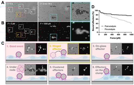 z-Movi image analysis and data selection criteria. z-Movi experiments acquired brightfield (A) and fluorescence (B) images during the force application. The brightfield images were used to examine the confluency of the monolayer and guide the manual selection. The fluorescence images were used to track the effectors whether being lifted. Zoom-ins were the representative snapshots of selected cases. Of note, if the effector escaped from the region of interest (ROI) but was not lifted during the force application (hinged, 2), the selected effector was considered as attached. Additionally, when the effectors were located on the glass surface (3), under the force node (4), clustered (5), or laid on the target cell clumps (6), these events were excluded from the analysis. Besides the listed conditions, the event was considered as a good event (1) for further analysis. (C) During experiments, the z-Movi applied a constant acoustic force ramping, increasing the lifting force from 0–1000 pN in 2.5 min. The lifted effectors accumulated at the acoustic force node. (D) Comparison between Bound cells (%) vs. Force (pN) before and after the manual selection was calculated and shown. A significant difference was seen after applying manual selection criteria. Thereby, consistent manual selection criteria are required across all runs during analysis.