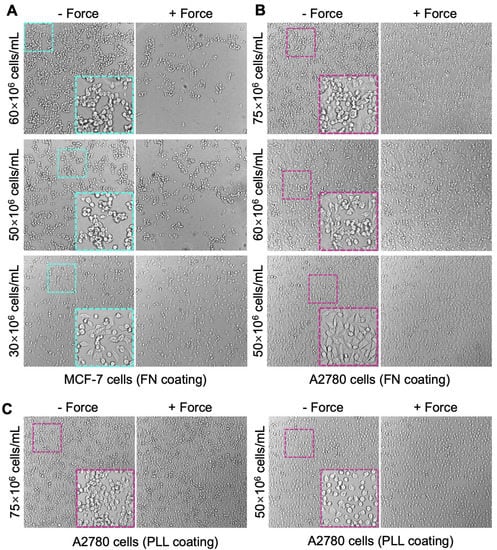 Monolayer cell seeding. MCF-7 cells (A) and A2780 cells (B) were seeded in the flow chamber at multiple density from 30 × 106 to 75 × 106 cells/mL to make the monolayer. The glass surface of the flow chamber was pre-coated with FN to enhance cell attachment. Representative images of the monolayer (at each seeding condition) after 2 h incubation at 37 °C (i.e., −Force) and then validation using acoustic force (i.e., +Force) were shown. After validation, weakly adhered cells were lifted from the coated surface and washed out using complete medium. (C) PLL coating was also tested to make A2780 cell monolayer at 75 × 106 (left) or 50 × 106 cells/mL (right) seeding density. Representative images of the monolayer after 2 h incubation with (+Force) or without (−Force) validation were shown. Insert: the zoom-in images showing the confluency of cell monolayer and the cell morphology.
