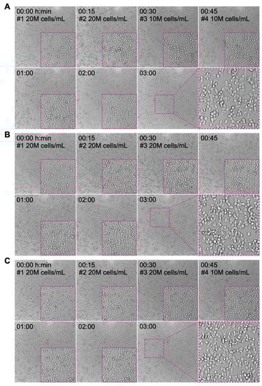 To improve the seeding confluency while minimizing cell clumping, a multi-seeding strategy was conducted. MCF-7 cells at 20 × 106 cells/mL density were loaded into the z-Movi chip with FN coating and incubated for 15 min at 37 °C. Cell seeding with a density of 20 × 106 or 10 × 106 cells/mL was then repeated one to three more times under the same condition to achieve a final density equivalent to 60 × 106 (Figure 4A,B) or 70 × 106 cells/mL (Figure 4C). As shown in Figure 4, the monolayer after two rounds of seeding (20 × 106 + 20 × 106 cells/mL) exhibited an increased confluency with similar levels of cell spreading on the surface as compared to one-time seeding at 30 × 106 cells/mL (Figure 3A). Additional seeding with either 20 × 106 or 10 × 106 cells/mL further promote the confluency of the monolayer but with noticeable cell clumping incidence. Although the clumping level is less than the one that occurred when seeding at 50 × 106 or 60 × 106 cells/mL (Figure 3A), clumped cells were hardly spreading out and failed to firmly adhere on the surface, which is not suitable for avidity measurement.