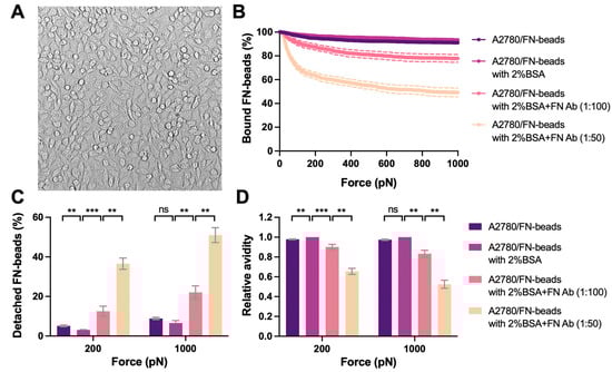 Avidity measurement of tumor cell monolayer interacting with ECM coated beads. (A) A2780 cells were seeded at the density of 50 × 106 cells/mL. A stable monolayer was formed after 1 hr incubation at 37 °C. After validation the monolayer was used as the ‘Target’. The representative image of the monolayer was shown. FN proteins were coated on the beads as the ‘Effector’. 2% BSA was used in the complete medium to block the non-specific binding. The FN antibody was used to treat the FN-beads at 1:100 or 1:50 dilutions for 1 h to block its interaction with the ‘Target’. The ‘Effectors’ pre-treated with indicated conditions were flushed into the flow chamber and interacted with the ‘Targets’ for 2.5 min before the acoustic force was applied. (B) The percentage of ‘Effectors’ bound to ‘Targets’ under the force from 0 to 1000 pN was measured and analyzed to indicate the avidity. (C) The percentage of detached ‘Effectors’ under each treatment conditions at 200 pN and 1000 pN of force was plotted. (D) The avidity relative to that of A2780/FN-beads with 2% BSA was calculated and presented. Data were collected from at least three independent experiments. Error bars are mean ± S.E.M.; ns = not significant; ** p < 0.01; *** p < 0.001, assessed by unpaired two-tailed Student’s t test.