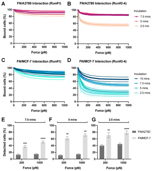 We next performed the cell–ECM avidity measurement (Figure 1C). To visualize the effector cells during the avidity measurement, A2780 and MCF-7 cells were stained with the CellTrace™ Far Red dye. The ECM protein FN was coated on the glass surface (50 μg/mL) and incubated with stained cancer cells for 2.5 to 15 min before the avidity measurement. We observed that A2780 cells (Figure 6A) exhibited significantly higher avidity with FN than MCF-7 cells (Figure 6C). For example, after incubation for 5 min, 11–14% of A2780 cells were detached from the FN layer at 200–1000 pN (Figure 6B,F), versus 62-71% for MCF-7 cells (Figure 6D,F). A similar trend was observed with the avidity measurements after 7.5 min and 2.5 min incubation (Figure 6E,G). Moreover, to achieve the same level of avidity (e.g., 40% detached cells at 1000 pN) A2780 required a shorter interacting duration than MCF-7 (e.g., 2.6 min versus 12.5 min). Additionally, four runs of experiments were conducted for each z-Movi chip. Notably, the avidity of the Cell-ECM interaction measured during the first runs was always significantly higher than that determined via the other three runs, which produced more consistent results (Figure 6A–D). For better reproducibility, we established a protocol by excluding the data from the first runs for each chip. Taken together, these observations indicate that different cancer types exhibit substantially different cell-adhesion capacities to the ECM.