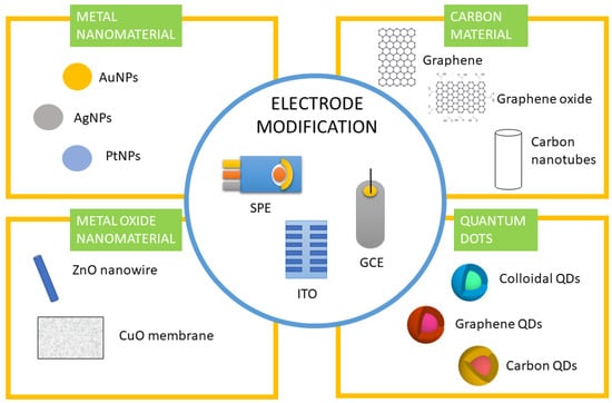 - Pingarrón, J.M.; Villalonga, R.; Yáñez-Sedeño, P. Nanoparticle-Modified Electrodes for Sensing; CRC: Boca Raton, FL, USA, 2014. [Google Scholar]