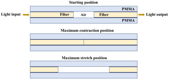 Several prototypes were developed before the final version. Initially, flat platforms that moved along the guides located on the sides of the sensor were used, but there were some issues correctly fixing the fiber position in order to achieve a good optical path alignment. In the next iteration, SMA connectors were included, which allowed us to set the position correctly, but their weight was too high to allow the displacement of the platforms. To solve this issue in the final prototype, a part of the optical fiber was stripped to introduce it into the holes, which allowed us to fix its position and have a low weight. Since the moving end of the fiber never leaves the fixed platform (Figure 1d), the integrity of the optical fiber is ensured and therefore no other protection technique is required. Additionally, we decided to fix one of the sensor platforms and keep it in a static position to achieve more accurate measurements by allowing the movement of only one platform.