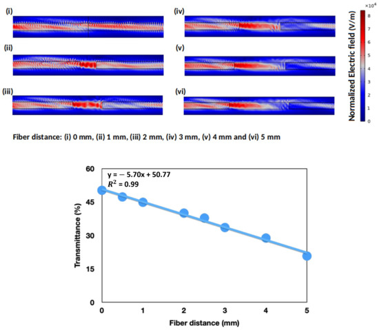 The results obtained from the simulations are summarized in Figure 3. Images from (i) to (vi) represent some of the normalized electric fields obtained using COMSOL, depending on the distance between the optical fibers. The surface color system represents the normalized electric field throughout the device, with dark red, dark blue, and bluish-red for high, low, and intermediate values, respectively. As expected, the electric field reaching the output of the receiving fiber on the right decreased when the distance between fibers increased. These losses were associated with the scattering and dispersion of light when traveling from the light-input optical fiber to the detector. The transmittance for each distance was calculated and plotted in Figure 3, showing a linear relationship between these two variables in the range under study.