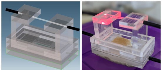 As mentioned above, the first sensor prototype was composed of two flat platforms that incorporated the optical fibers. Consequently, the medium and the fiber were in contact, which rendered results highly dependent on the considered medium. Subsequently, the sensor was modified in such a way that the fibers were located on the top part of the platform (Figure 4). In this case, the behavior of the sensor was independent of the employed medium, and its response only depended on the stretch of the tissue since the fibers moved jointly with the cardiac tissue sample. To ensure this synchrony, the lower part of the sensor had small protrusions designed to position and attach the tissue. Hence, one of the platforms was displaced a distance equal to the stretch experienced by the tissue. Since, with this modification, the transmission medium of the light emitted by the optical fiber was always the same (i.e., the air contained in the cavity), it allowed us to carry out experiments with different culture media without requiring either variations in the electronic system or adjustments of the output signal in the post-processing.