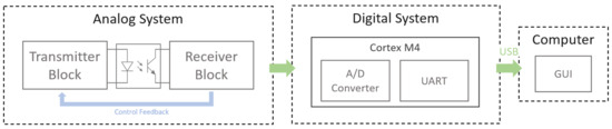 The portable design of the sensor’s electronic system leads to its versatile use in different places such as hospital laboratories or cell/tissue culture rooms. For this purpose, a 5 V power supply was selected for the whole system like a USB port of a laptop. The block diagram of the system is shown in Figure 5, which contains an analog part dedicated to the emission and reception of guided light using an optocoupler, a digital one based on a microcontroller, and a graphical user interface (GUI) to visualize data in real time. The analog part includes a feedback control that automatically adjusts some details of the sensor, such as temperature compensation over time, for which a second optical fiber (with a cut between the ends to give it the same properties as the one that acts as sensing element) has been included at the bottom of the sensor (Figure 4).