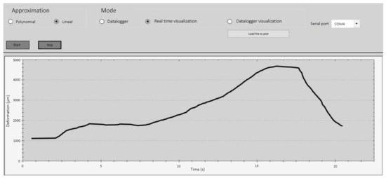 Graphical user interface developed for the sensor system. This example shows a change in the deformation (ordinate) versus time (abscissa) in the data from the COM4 port.