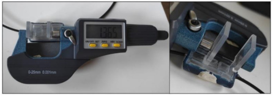 To characterize the sensor performance, several experiments were carried out with the setup presented in Figure 7. The setup consisted of the sensor, a digital micrometer with a resolution of 1 m and an accuracy of ±2 m; the custom-made electronic instrumentation system and an oscilloscope were used to measure the response or output signal of the system, as well as to verify that the complete system worked as expected.