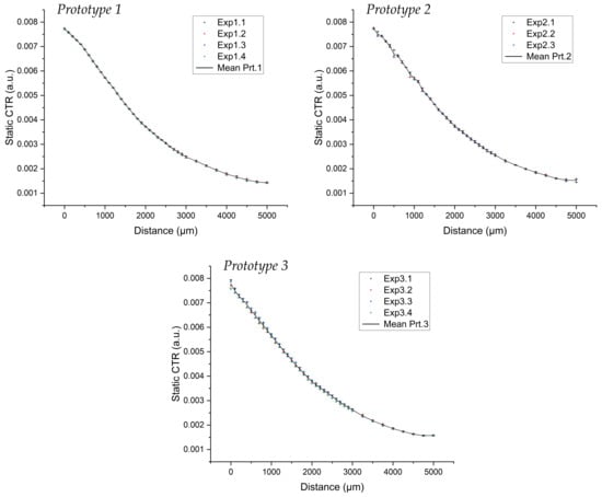 To evaluate the variability of each prototype over iterations, the standard deviation (SD) of the static CTR was calculated for each of them. The results are shown in Figure 9 together with the mean calculated for each prototype. The low SD of all cases indicated that each sensor has low variability over different tests. The average SD values for the different prototypes are , and , respectively. The maximum value obtained when calculating the SD was in prototype 3, which was for a null gap distance between the fibers. The standard deviation values were slightly worse for shorter distances and presented stable values in the order of once the separation distance reached 1100–1200 mm.