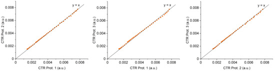 To assess the agreement between prototypes, first, an x-y graph including the line of equality (Figure 10) was represented. This graph provided a first view of the relationship between the two variables (the two prototypes compared in our case). The close distance of the points to the diagonal indicates a high degree of agreement.