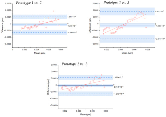 Bland–Altman statistics calculated for each pair of prototypes to assess the agreement between the different analyzed prototypes.