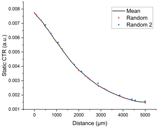 Static CTR for a test performed to verify the behavior of the sensor for random distances. Note that the mean curve represented in this figure is the mean of the three prototype curves.