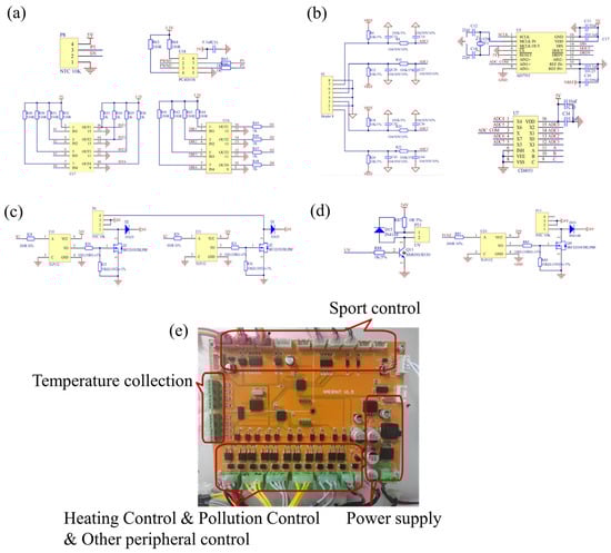 (a) Motion control module schematic design; (b) Temperature control module acquisition circuit schematic design; (c) Temperature control module heating circuit schematic design; (d) Anti-pollution control module schematic design; (e) Circuit board physical picture.