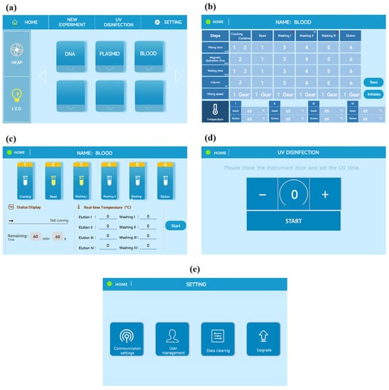 Software development entails the development of both lower-level firmware and upper-level user interfaces for human–machine interaction. The lower-level firmware development involves embedded programming of the STM32F103C8T6 microcontroller chip, using the Keil5 development environment to create a program for automating the nucleic acid extraction process. Temperature control is achieved using the Proportional-Integral-Derivative (PID) algorithm, which regulates the STM32F103C8T6 chip on the control circuit board. This allows the timer to generate a pulse-width modulation (PWM) waveform with an adjustable duty cycle, enabling precise control of the current to the heating element. Serial communication is employed between the microcontroller and the touch screen (Beijing DWIN Technology Co., Ltd., Beijing, China) to establish a communication protocol between the lower-level controller and the upper-level software, thereby achieving automation of nucleic acid extraction. The primary focus of the lower-level development is to facilitate effective human–machine interaction. The user interface comprises five key sections. The Section 1 is the main interface (Figure 3a), which enables users to directly select options for air filtration lighting and adjust the built-in experimental parameters based on specific requirements. The Section 2 is the program editing interface (Figure 3b), allowing users to set the required experimental parameters during the extraction process, such as step durations, temperatures, rotational speeds, and volumes of various reagents. Click the red dot to clear the value in this column. The Section 3 is the program execution interface (Figure 3c), which provides a real-time display of the experiment’s status, remaining time, and temperature during the extraction process. The Section 4 is the UV disinfection interface (Figure 3d), employed for UV disinfection of the instrument’s interior before or after experiments to effectively mitigate batch contamination. The Section 5 is the system settings interface (Figure 3e), providing users with the capability to update and upgrade the instrument’s software, perform communication calibration, and meet diverse user requirements and preferences effectively.