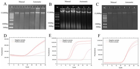 Nucleic acid extraction was performed on Pseudomonas aeruginosa samples, mouse liver tissue, and human blood using both manual and automated methods, as shown in Figure 7A–C. The manual method required operation times of 54 min and 50 s, 49 min and 30 s, and 44 min and 40 s, respectively. In contrast, the automated instrument completed the process in 33 min, 30 min, and 28 min for the corresponding samples. The nucleic acid extraction system we developed yields nucleic acid concentrations comparable to the manual method but significantly reduces the extraction time. It eliminates complex operations, making it well-suited for high-throughput and rapid extraction requirements. To remove RNA contamination, an appropriate amount of RNA degrading enzyme was added, resulting in an OD260/OD280 ratio ranging from 1.8 to 2.0.