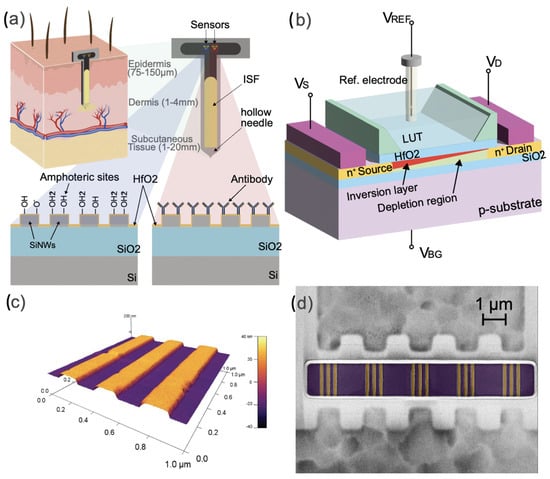 In this context, field-effect transistors (FETs) present excellent potential for the development of wearable and continuous biosensors. They offer advantages such as miniaturization, low power consumption, and the ability to develop label-free bioassays, enabling continuous monitoring. Specifically, fully depleted silicon nanowires (SiNWs) have emerged as promising candidates for integrating a multiplexed biosensing platform [5,6,7,8].