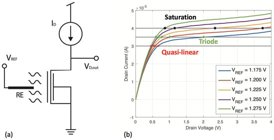 We propose to investigate a constant drain current operating method for the SOI field-effect transistor, wherein the front gate, back gate, and source terminals are biased with a constant voltage, and the output drain voltage is monitored as the output voltage while the drain current is kept constant (Figure 2a). Our findings demonstrate that the sensor response to pH changes in solution is highly tunable according to the bias conditions of the transistor, thus its operating regime. We compare the linear, triode, and saturated regions (considering the channel length modulation effect) under weak, moderate, and strong inversion conditions determined by the gating voltage, V (Figure 2b). Through our study, we analyzed the behavior of the drain voltage evolution in response to different pH levels across various transistor regimes. The amount of inversion charge in the nanowires’ silicon channels, and consequently the working regime (weak, moderate, or strong inversion), are controlled by the applied reference voltage. Similarly, the operation region of the transistor is determined by the drain-to-source voltage drop and can fall into three categories: linear, triode, or saturation. The behavior of the sensor, including its sensitivity, stability, and power consumption, is significantly affected by both the channel inversion conditions and the operation region.