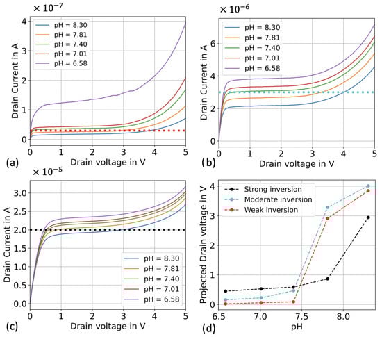 Figure 3 presents I-V curves for different working regimes, achieved by varying the applied V, and at different pH values. The constant drain current is indicated by horizontal intercepting lines, and the output calibration curve is found to be significantly influenced by the working region. In the case of weak inversion (Figure 3a), the transistor enters the saturation region at very low drain voltage values, resulting in a reduced triode region. This behavior leads to a pH response that predominantly utilizes the saturation region and, to a lesser extent, the breakdown region. Consequently, there is only a small concentration window where the sensor exhibits high sensitivity, reaching up to 6 V/pH. The sensor operating in weak inversion mode demonstrates a high sensitivity as it approaches the saturation region, making it well-suited for use as a threshold sensor in a wide range of applications.