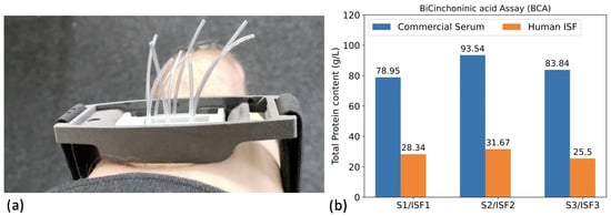 (a) Picture of the device used to collect human ISF. The collector consists of a rigid support with micro-needles directly connected to Tygon tubes. (b) Total protein content assessed by BCA assay on (i) the commercial sera samples (S1), (S2) and (S3) and (ii) on ISF of the three human healthy volunteers.