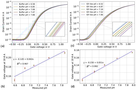 To compare the pH sensitivities of the silicon nanowires in both “buffer” and “ISF-like” matrices, we conducted voltage sweeping experiments in top-gate configuration. The reference voltage was swept from −0.5 V to 1.5 V using an external Ag/AgCl reference electrode immersed in the liquid under test. The applied back-gate voltage (V) was 0 V, the source voltage (V) was 0 V, and the drain voltage (V) was 0.5 V. We first exposed the sensors to the five different pH solutions from the buffer set, followed by the five different pH solutions from the ISF-like set. Figure 5a,c illustrates the transfer characteristics of both the buffer and ISF-like solutions in a semi-logarithmic scale.
