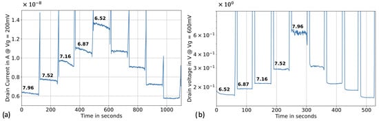 The same silicon nanowire sensors were measured in the optimized constant-current method, following their evaluation in top-gate configuration. The experimental protocol followed a similar procedure: we generated a pyramid in the ISF-like solution, established a calibration curve, and tested the unknown samples. The transistors were operated within the moderate inversion regime, employing a reference bias of 0.6 V, a fixed drain current of 2 µA, and a source and back gate bias of 0 V. The drain voltage was recorded over time.