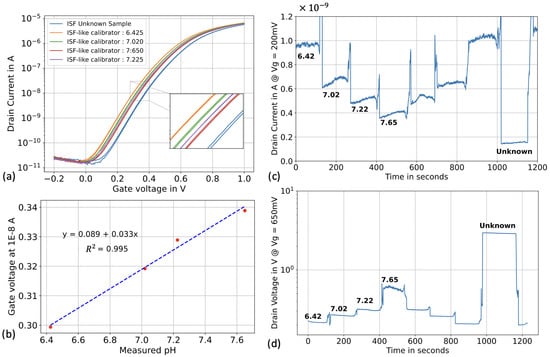 Following the voltage sweeping test, we proceeded to real-time pH sensing in top gate configuration. We followed the same protocol as described in the previous section, injecting the ISF-like calibrators for 120 seconds to form a pyramid shape, followed by injection of the “unknown” ISF sample (Figure 7c). The pH value of the “unknown” sample was back-calculated using a “log-lin” fitting. Finally, we used the constant-current operation method following the same protocol. The transistors were operated within the moderate inversion regime (Figure 7d).