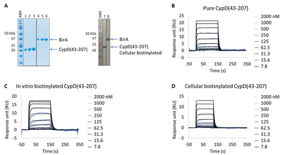 Extract2Chip method validation on Cyclophilin D (CypD). SPR kinetic characterization of CypD’s interaction with a known inhibitor (CYPD-27). (A) SDS-PAGE analysis of pure CypD(43-207) and BirA proteins (left) and confirmation of CypD(43-207) cellular biotinylation with BirA by western blot (right). MM, molecular marker. Lanes 1–3: 1, 2, and 3 µg of pure CypD(43-207). Lanes 5–6: 1, 2, and 3 µg of pure BirA. Lanes 7 and 8: soluble cell lysates showing the detection of CypD(43-207) and BirA using anti His-Tag or Flag-Tag antibodies, respectively. (B–D) Kinetic characterization of pure (B), in vitro biotinylated (C), or cellular biotinylated (D) CypD(43-207) interaction with CYPD-27. The sensorgrams show the interaction responses of different immobilized CypD(43-207) proteins upon injection of CYPD-27 (t = 0 s) at increasing concentrations or upon washing (t = 120 (D) or 150 s (B,C)). X-axis: time (s); Y-axis: response unit (RU).