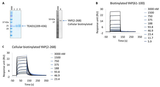 Extract2Chip applied on a recalcitrant protein. SPR kinetic characterization of transcriptional enhancer factor TEF (TEAD1) with synthetic biotinylated Yes-associated protein (YAP) peptide and cellular biotinylated YAP protein. (A) SDS-PAGE analysis of pure TEAD1(209-436) protein (left) and confirmation of YAP(2-268) cellular biotinylation by Western blot (right). MM, molecular marker. Lanes 1–3: 1, 2, and 3 µg of pure TEAD1(209-436). Lane 4: soluble cell lysates showing the detection of YAP(2-268) using His-Tag antibody. (B,C) Kinetic characterization of immobilized pure biotinylated YAP(61-100) (B) and cellular biotinylated YAP(2-268) (C) with TEAD1(209-436). The sensorgrams show YAP proteins’ responses upon injection of TEAD1 (t = 0 s) at increasing concentrations or upon washing (t = 120 s). X-axis: time (s); Y-axis: response unit (RU).