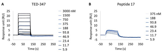 Following this observation, the study of potential inhibitors of the YAP:TEAD complex interaction was further investigated in the cellular biotinylated YAP(2-268) protein. Two alternative approaches are known to disturb the PPI. The closest method works via a TEAD surface binder that blocks the YAP binding domains (e.g., Peptide 17) [24]. A more sophisticated allosteric mechanism is also described, showing that occupancy of the deeply buried lipidation pocket of TEAD with an artificial ligand prevents the PPI (e.g., TED-347) [23]. The binary complex formation of TEAD1 to the different TEAD binders was determined using biochemical assays or SPR at different timescales, and it was found to be 3.4 × 10−7 M (IC50) or 1.4 × 10−6 M (KD), respectively, for the lipidation pocket binder and 8.3 × 10−9 M (KD) for Peptide 17 (data not shown). TEAD1(209-426) was incubated with saturating concentrations of each binder and injected onto biotinylated YAP(2-268) surfaces, up to a maximum concentration of 3 µM. The selected TEAD1 concentration and chosen compound to TEAD1 ratios in the solution were ensured to be 20 times above the KDs determined from binary complex formation studies, after 18 h of incubation at 30 °C. The lipid-pocket engager TED-347 displayed a decrease in affinity (Figure 4A) when compared with TEAD1 apo-form, whereas the surface binder Peptide 17 (Figure 4B) significantly suppressed the interaction between the TEAD1 and YAP proteins (Table 5 and Figure S3). This finding is in line with the observation that Peptide 17 exhibits a higher affinity for TEAD1 compared to YAP:TEAD1 interaction [36]. It is important to note that the surface integrity of YAP(2-268) was carefully monitored and confirmed to be intact throughout the entire time-course of the experiment, by re-injecting TEAD1-apo at the end of all assays and observing the same kinetic profile as in the beginning of the experiment. These results show the importance of this developed methodology in contributing to the development of new approaches for the study of intrinsically disordered proteins in drug discovery campaigns.