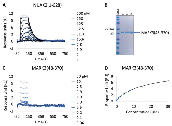 The purified His6-TEV-MARK3(48-370) was immobilized using the same approach as GST-NUAK2(1-628). The protein was diluted to 3 µg/mL and coupled to the surface with 5 and 12 min of injection time to reach 1000 to 1700 RU.