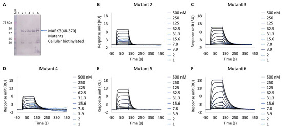 Extract2Chip applied to drug target surrogate validation. SPR kinetic characterization of the interaction between MARK3(48-370) Mutants 1–6 and NUAK2 inhibitor GSK461364A. (A) Western blot detection of MARK3(48-370) Mutants 1–6 in soluble cell lysates, after co-expression with BirA, using Streptavidin AP Conjugate. Lanes 1–6, MARK3(48-370) mutants 1 to 6. (B–F) Kinetic characterization between cellular biotinylated MARK3(48-370) Mutants 1–6 and GSK461364A, respectively. The sensorgrams show the responses of the interaction between different immobilized cellular biotinylated MARK3(48-370) mutants after the injection of increasing concentrations of GSK461364A (t = 0 s), or upon washing (t = 140 s). X-axis: time (s); Y-axis: response unit (RU).