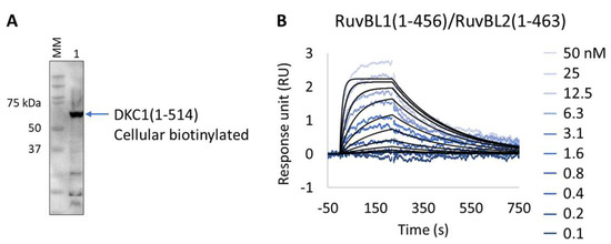 Extract2Chip applied for the validation of ternary complex formation. (A) Western blot identifying biotinylated Dyskerin pseudouridine synthase 1 (DKC1) (1-514) from soluble cell lysates, after co-expression with BirA, using streptavidin HRP conjugate. (B) SPR kinetic characterization of the interaction between immobilized cellular biotinylated DCK1(1-541) and RuvBL1(1-456)/RuvBL2(1-463). The sensorgrams show the responses of the interaction between DCK1(1-514) and RuvBL1(1-456)/RuvBL2(1-463) after injection at increasing concentrations (t = 0 s) or upon washing (t = 200 s). X-axis: time (s); Y-axis: response unit (RU).