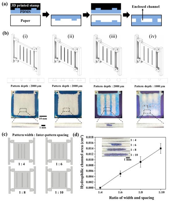 Effect of stamp mold geometry on enclosed channel formation in paper. (a) Schematic illustration of double-sided imprinting for the generation of hydrophobic barriers. (b) Schematic illustration of various shapes of the stamp mold including (i) rectangular, (ii) trapezoidal, (iii) round with low depth, and (iv) round with high depth and its optical images for patterned PDMS barriers. (c) Schematic illustration of changes in the different ratios (channel width: inter-channel distance) of PDMS-coated mold. (d) The formation of a hydrophilic channel at various width ratios. The inset in (c) shows the cross-section images of the generated hydrophobic barrier by flowing methylene blue (MB) aqueous solution on the hydrophilic channel. The results represent the mean (±SD) of ten independent experiments.