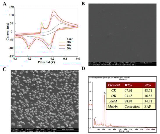 Surface modifications on the graphene/gold nanoparticles (AuNP) functionalized electrode. (A) Electrochemical deposition of nanocomposites on the electrode surface; (B,C) Scanning electron microscope (SEM) spectra of the bare indium tin oxide (ITO) and nanocomposite−modified electrodes, respectively; (D) Energy dispersive spectroscopy (EDS) spectrum of the nanocomposite−modified electrodes.