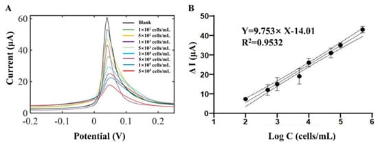 GD2-positive cells biosensing. (A) Differential pulse voltammetry (DPV) curves of GD2−-positive cell detection from 102 to 5 × 105 cells/mL in dulbecco’s modified eagle’s medium (DMEM). (B) Linearly dependent curve between the concentration and the current difference (ΔI = IDMEM − IGD2+).