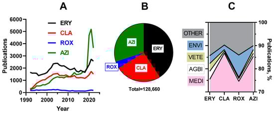 (A) Scopus database publications (1992–2022) by macrolide antibiotics (‘erythromycin’ OR ‘clarithromycin’ OR ‘roxithromycin’ OR ‘azithromycin’ mentioned in title, abstract, or keywords). (B) The share of publications of each representative of macrolides. (C) Distribution of publications by subject MEDI (medicine), AGBI (agricultural and biological sciences), VETE (veterinary), ENVI (environmental science), and OTHER areas.