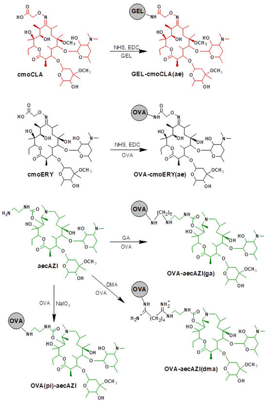 Thus, along with homologous GEL-cmoCLA(ae), heterologous OVA-cmoERY(ae), and several heterologous conjugates based on AZI-derivative, were synthetized to study their effect on assay specificity.