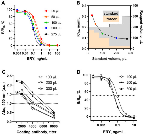 To address this, the volume of the tracer was reduced by proportionally increasing its concentration, ensuring that the total volume of the reaction mixture did not exceed 300 μL, as shown in Figure 3B. Increasing the volume of the ERY standard in this experiment from 25 to 275 µL resulted in an improvement in assay sensitivity (IC50) from 0.31 to 0.091 ng/mL.