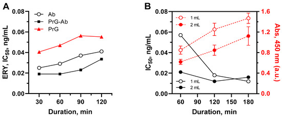 (A) Effect of oriented antibody coating and competitive stage duration on assay sensitivity. Ab, coated antibody; PrG, coated protein G in self-assembly assay; PrG-Ab, antibody captured by protein G in step-by-step assay; (B) dependence of IBA parameters on the duration of incubation. Each IC50 values were calculated from the standard curves generated from respective assay variants using triplicate ERY concentrations. Absorbance values represented by average (n = 3) ± SD.