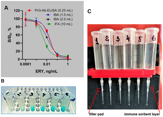 (A) Standard curves of ERY determination from different volume samples conducted in PrG-Ab ELISA (250 µL), IBA (1 mL and 2 mL), and IFA (10 mL). Each symbol indicates the average value (n = 3), and the error is represented by the standard deviation. (B) Visual results of IBA of 1 mL-solutions ERY 1000 pg/mL–0.1 pg/mL, 0 pg/mL (1–6). (C) Instillation of 10 mL sample through a microtip with a layer of sorbent on the filter in IFA.