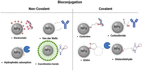 In order to allow protein adsorption without altering the natural structure of the bioactive molecule, it is essential for the biomaterial surface to be biocompatible [84]. To ensure this, a bioconjugation protocol is applied in the biosensor. Bioconjugation involves the interaction of chemical or functional groups between NPs and biomolecules [85,86]. Additionally, it is important to mention that the properties can affect the efficiency of the connection with the biomarkers, including the optimal distance between biorecognition molecules and the nanostructure, the pH of the storage buffer used, as well as potential modifications to the biological and antigenic properties of biomolecules after conjugation. Hence, it is relevant to develop different approaches to nanostructure conjugation [87,88], using custom functional groups (such as primary amines, carboxylates, cis-diols, and sulfhydryls) on nanosurfaces [62,89].