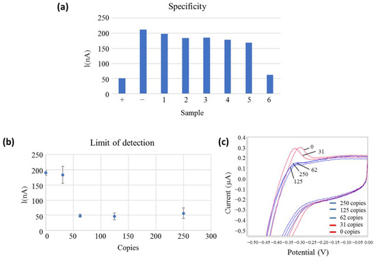 (a) Off-chip electrochemical measurements of the specificity assay. The bar height represents the measured oxidation peak current related to the MB oxidation reaction. The sample is represented at the bottom. SARS-CoV-2 (+), non-template control (−), Coronavirus OC43 (1), Enterovirus 68 (2), Rhinovirus (3), MERS coronavirus (4), SARS-2003 coronavirus (5) and Pool of respiratory viruses (6) and current peak (nA) are represented on the left side; (b) Electrochemical limit of detection measures. The copy number is represented at the bottom (Copies), and the current peak (nA) is represented on the left side. All samples are measured in triplicates, and the standard deviation is represented in bars; (c) voltammetry curves of the electrochemical limit of detection measures positive samples and negative samples in blue and red, respectively. Potential is represented at the bottom (V), and the current peak (mA) is represented on the left side.