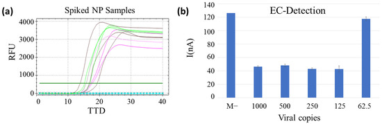 (a) Limit of detection of the extraction-free method with spiked samples. Positive controls (viral RNA) in pink, spiked NP samples in green (250 copies), brown (125 copies) and the blue circled line (62.5 copies) and the non-template control is represented by black crossed line. TTD is represented at the bottom, and RFU on the left. (b) Limit of detection of the extraction-free RT-LAMP by electrochemical detection. Copy number per reaction and negative clinical sample (M−) represented in the bottom and current peak (nA) on the left. All samples were measured in triplicates, and the standard deviation is represented in bars.
