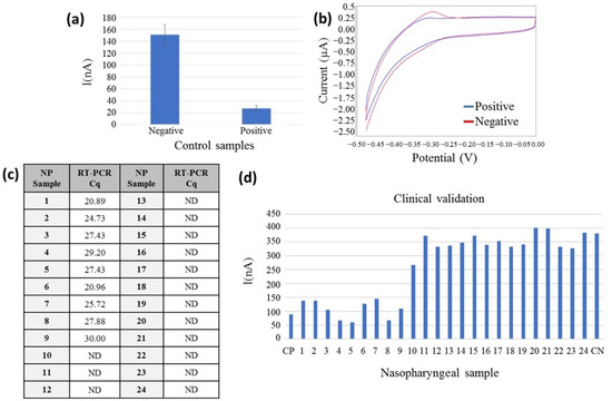 For the validation of the electrochemical on-chip configuration, 24 clinical NP samples were measured on-chip. All the NP samples were monitored with the reference method; the Cq of each sample can be observed in the table of Figure 5c. NP samples were heated at 95 °C for 10 min and amplified by the EC-LAMP method, following the detection on the chip. As can be observed in Figure 5d, the electrochemical current signal is lower for the nine positive RT-PCR NP samples. The 15 NP negative samples obtained a signal two-fold higher than the positive ones, demonstrating the feasibility of the developed sensor for the detection of the SARS-CoV-2 virus in heated clinical NP samples. A two-sample t-test was used for comparison of electrical current figures associated with positive (n = 9) and negative (n = 15) samples. It showed a statistical t of 17.08 and a critical value, tc, of 2.07 for a 95% confidence level. The electrical current intensity measured shows a statistically significant difference between these two datasets (p < 0.001). Differences in absolute values of current intensity between clinical samples in a closed chamber with those studied before obeying both different samples and electroactive volumes in a microfluidic chamber or in an off-chip configuration.