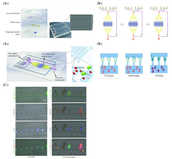 Schematic illustration (A1,A2) Integrated microfluidic device for CTC enrichment and analysis (B1,B2) Development of Integrated Microfluidic Device for Simultaneous Enrichment and Analysis of Circulating Tumor Cells, (C1) Comparative Immuno-staining Analysis of Captured Cells in PBS and Human Blood Samples []. (Reproduced with permission from Su, W.; Yu, H.; Jiang, L.; Chen, W.; Li, H.; Qin, J, Disease Markers; published by Hindawi, 2019).